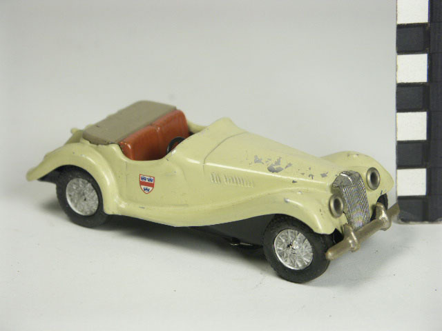 bedrukt en gelakt blik; auto in crème-rood-bruin; radiator met omlijsting, 2 koplampen en voorbumper in blank metaal; stuur zwart, zitplaatsen rood; op de zijkanten rechts en links een wapen (schildvormig) wit-rood-witte banen horizontaal met 3 kroontjes in blauw; onderkant in zwart met opschrift-ingeperst MADE IN ENGLAND SCALEX PAT.PDG.25404S2 MG.T.F. 4 wielen in zilverkleur met 4 ...