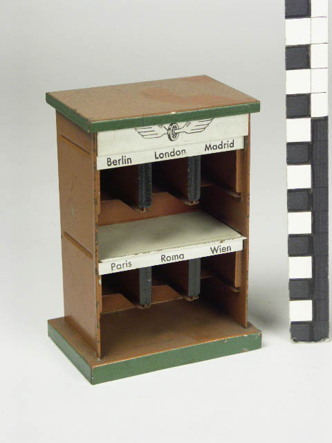 bedrukt blik; bergkast in bruin, met groene randen; schappen met plaatsnamen in wit; plaatsnamen, spoorwegemblemen en voor- kanten tussenschotten in zwart bedrukt; 6 vakken: BERLIN LONDON MADRID PARIS ROMA WIEN ; onderste plank uitneembaar; aan onderkant in goudkleur met zwarte letters: JOS,MOOG KöLN; merkteken