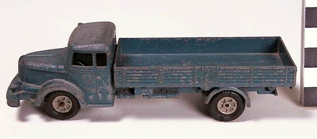 bedrukt blik; vrachtauto in blauw grijs; 2 voor- en 2 achterwielen, blank met 2 voor en 4 achter-rubberbanden in zwart de auto is geponsd; aan onderkant: MäRKLIN MADE IN GERMANY