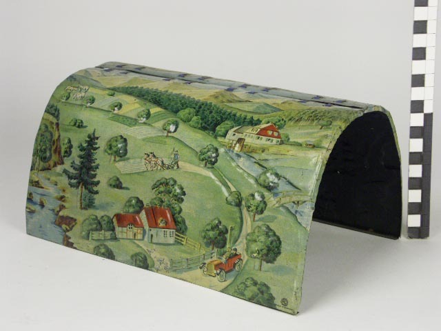 bedrukt blik; tunnel met berg-dal-landschap in groen-blauw-bruin-rood; voorstellend een landweg door dal, auto met toeristen, boerderijen, beek met brug, ploegende boer, watermolen- koeien, bomen, akkers, weilanden met op achtergrond bergen; binnenkant zwart; 2 in elkaar schuivende bogen, hetzelfde bedrukt; geribbeld en geponst metaal, in relief gestampt; links voor en rechts achter: MADE IN GERMANY en ...