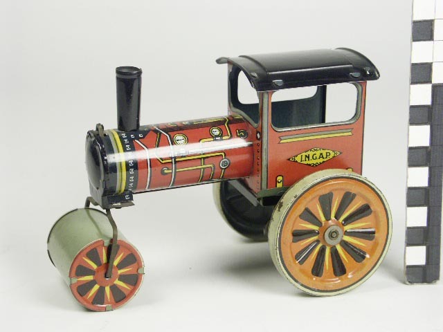 bedrukt blik; wals in rood-zwart-geel-wit-grijs-lichtgroen bedrukt; op zijkanten cabine I.N.G.A.P. in zwart op geel; aan onderkant ingeperst INGAP ; op achteras spiraalveer met vaste sleutel; door tandwieltje, dat half getand is, maakt de traktor voor- en achterwaartse beweging;