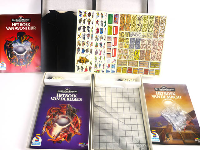 het spel bestaat uit 2 kartonnen dozen met inhoud en 4 avonturenboeken; verder zijn er een informatieblad en 5 persinfomappen; doos 'basisspel' bevat: het boek van de regels; het boek van avontuur; documenten van kracht; documenten van de lotgevallen; scherm; 20-zijdige dobbelsteen; 3 normale dobbelstenen, wit met zwarte punten; doos 'de instrumenten van de meester' ...