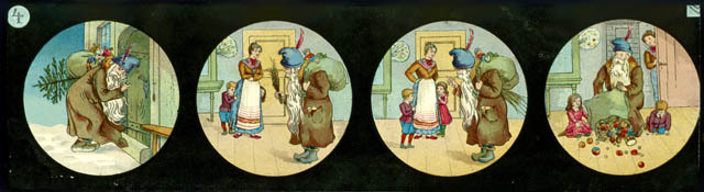 12 toverlantaarnplaatjes van enkel glas met een blauwe papieren rand; de glazen zijn genummerd (1 t/m 12); in de rechterbovenhoek het merk; a. avontuur met vliegenmepper; 2 personen; b. ongeluk met sleeën; 2 personen; c. ruzie om een schooltas; 3 personen (w.o. meester); d. kerstman brengt speelgoed; 4 personen; e. man met kiespijn bij tandarts; ...