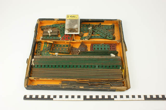 Twee dozen met Meccano onderdelen zonder deksel, niet toonbaar
