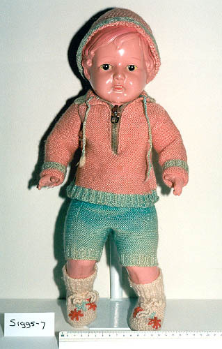 Pop geheel uit celluloid. Haren meegevormd en rood geverfd. Wenkbrauwen, ogen (grote zwarte pupil), lippen en tanden geverfd. Open mond, 4 tanden. Beweegbaar: kop, schouder en heup. Merk: Franse lelie ? 'Made in Japan' Kleding: Roze trui met groene randen, lange mouwen, kraag en ritssluiting van voren. Groene korte broek. Roze muts met groene rand ...
