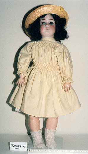 Pop met kop van ongeglazuurd porselein. Zwart krullend haar. Blauwgrijze glazen slaapogen met wimpers. Wenkbrauwen, wimpers, 2 ooghoeken, neusgaten, lippen, rond nagels en op vingers en tenen geverfd. Open mond, 5 tanden. Lijf en ledematen papier-maché en hout. Beweegbaar: kop, schouder, elleboog (kogel), pols, heup en knie (kogel). Merk: 'Germany / B.5.' Kleding: Geel katoenen ...
