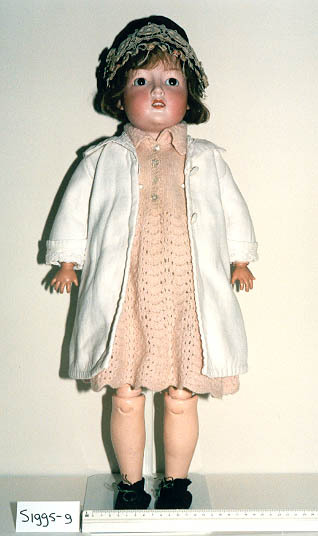 Pop met extra pruik. Kop van ongeglazuurd porselein. Halflang donkerblond haar met pony. Blauwe glazen slaapogen. Wenkbrauwen, onderwimpers, 2 ooghoeken, neusgaten en lippen geverfd. Open mond, 4 tanden. Lijf en ledematen (op de celluloid handen na) papier-maché en hout. Beweegbaar: kop, schouder, elleboog (kogel), pols, heup en knie (kogel). De pruik heeft donkerblond lang haar. ...