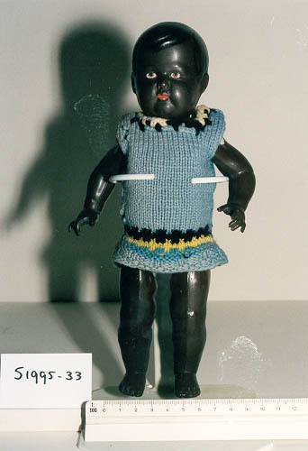 Negerpop geheel uit celluloid. Haar meegevormd en zwart geverfd. Wenkbrauwen, ogen (bruin), neusgaten en lippen geverfd. Gaatjes in de oren. Vaste kop. Beweegbaar: schouder en heup. Pop rammelt. Merk (op rug): schildpad in ruit '25 / Germany' Kleding: Blauw gebreide jurk, onder een zwart en geel werkje, bovenrand zwart en geel gehaakt.