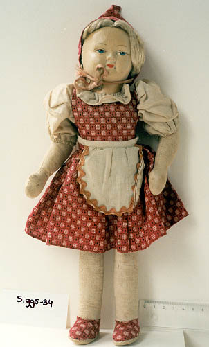 Pop van textiel gevuld met zaagsel. Blond haar met 2 vlechten. Het gezicht is op en in een stuk textiel met verflaag aangebracht, dat vervolgens op de kop is genaaid. Wenkbrauwen, ogen (blauw), neusgaten en lippen geverfd. Beweegbaar: schouder. Kleding: Jurk, kapje en schoenen van rode stof met patroon van zwarte bloemmotieven en witte streepjes. ...