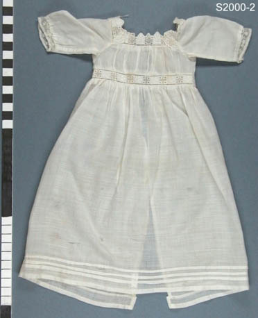 Witte doopjurk van katoenen batist met 3-kwart raglan mouw. Rechthoekige hals met inzet van kant. Verhoogde taille met tussenzetsels van kant. Gerimpeld lijfje, rok gerimpeld aangezet. Mouw afgezet met kant. Langs zoom 3 smalle opnaadjes. Middenachter open. Sluiting: in taille met drukknoop + lus, bovenkant rug knoop + lus, ½ drukknoop (andere ½ ontbreekt).