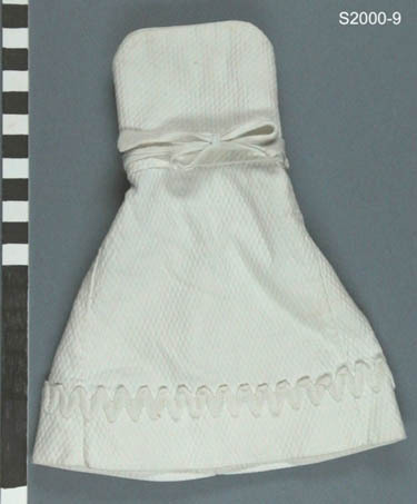 Strepless jurk van witte katoen met ingeweven ruitjes, model eind 19e eeuw
