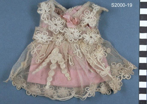 Jurkje van roze katoen zonder mouwen met overkleed van getamboureerde tul met krul en bloemmotiefjes