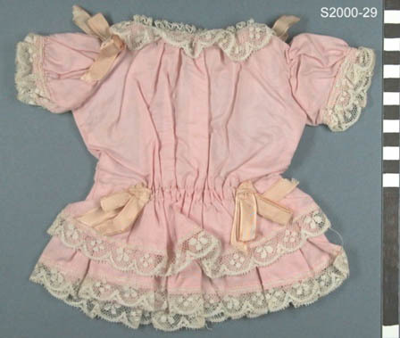 Jurkje van roze katoen met verlaagde taille en rok met 2 stroken, afgezet met kant, pofmouwen