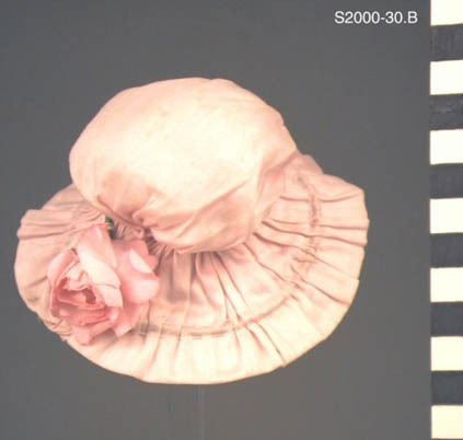 Hoed van roze zijde met roos en strikje