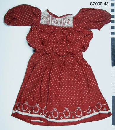 Jurk van rode katoen met witte cirkeltjes, ruime pofmouwen en kant op voor en achterpas, wijde rok