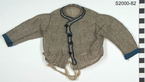 Jakje van beige met grijs gemeleerde wol met ronde hals en lange mouw. Hals en linker voorpand afgezet met dubbel blauw koord, hiertussen op het voorpand 4 bolle zwarte sierknoopjes. Aan mouwen manchet van blauwe zijde. Sluiting middenvoor: 2x haak + trens. In taille schuifband met veter.