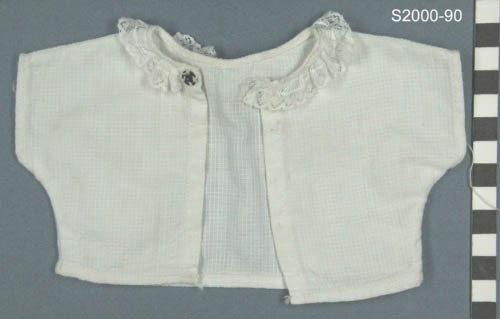 Witte katoenen blouse met ingeweven ruitmotief. Korte aangeknipte mouwen. Ronde