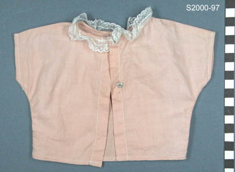Roze katoenen blouse met aangeknipte korte mouw. Ronde hals met kantje