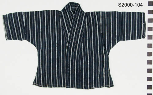 Donkerblauw katoenen blouse met witte lijnen ingeweven. Sjaalkraag. Aangeknipte