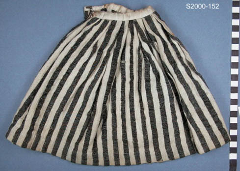 Wollen onderrok met ingeweven vertikale streep in wit en zwart. Tailleband van wit katoen met geplooid aangezette rok. Split in een zijnaad met haak + oog sluiting. Rok voor pop in klederdracht. Boerinne onderrok.