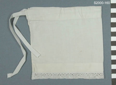 Onderrok van een rechthoekige lap witte katoen. Middenachter naad met split. Taillezoom met strikbanden. Zoom afgewerkt met kantje. Handwerk.