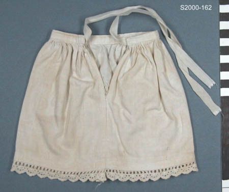Ongebleekt katoenen onderrok met tailleband, strikbanden split middenachter. Rok gerimpeld aan tailleband. Zoom afgezet met broderie. Machinaal.