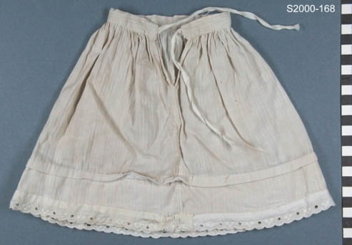 Ecrukleurige onderrok met ingeweven vertikale streep. Langs zoom een rand broderie en op 5 cm van de zoom een opnaad. Tailleband met horizontale streep. Gerimpeld aangezette rok. Een naad middenachter met split. Sluiting: 2 strikbanden aan tailleband.