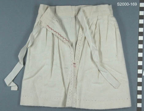 Ecrukleurige onderrok van geruwde katoen. Zoom en middenachternaad afgewerkt met rode flanelsteek. Rok geplooid aan tailleband (2,5 cm) gezet met glad gedeelte middenvoor. Tailleband van gladde ongebleekte katoen. Sluiting middenachter met 2 strikbanden. Onderaan split met rode tres afgewerkt met daaronder in roze het cijfer "4". Handwerk.