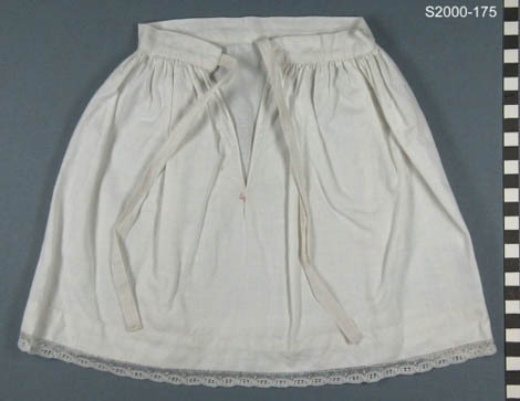 Witte katoenen onderrok met smalle baan voor en brede baan achter. Voor glad aan tailleband en achter gerimpeld. Middenachter split met 2 strikbanden aan tailleband. Zoom: 2,5 cm met afzetting van kant. Onder het split in roze steelsteek een "4". Handwerk.