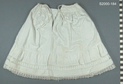 Wit katoenen onderrok met heupstuk en iets aangerimpelde gerende rok, 4 banen. Op 9 cm van de zoom een gerimpelde strook met kant en tussenzetsel van doorgestopte tule. 4x wit sierband geborduurd met taksteek en 2x opnaad. Vanuit midden heupstuk schuifband met strikbanden strik middenachter. Machinaal genaaid. Middenachter split met merk in rode kruissteek "HSS(" ...