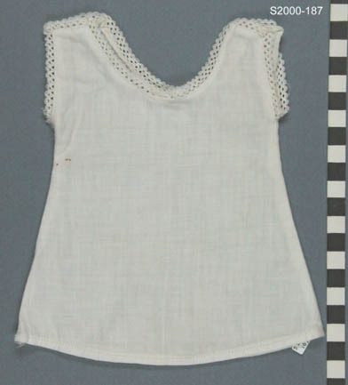 Wit katoenen hemd zonder mouw. Open schoudernaden zonder sluiting. Langs hals en armsgaten afgezet met kantje.