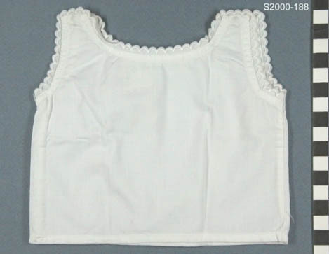 Wit katoenen hemd met sluiting op de schouder d.m.v. drukknoopjes. Langs hals en armsgaten afgewerkt met witte broderie in golf motief.