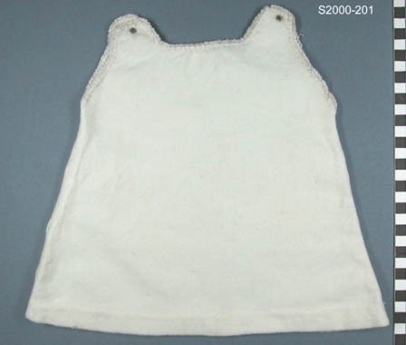 Ecru kleurig flanellen hemd. Geruwde katoen met sluiting op schouders d.m.v. drukknopen. Hals en armsgaten afgewerkt met festonsteek en gehaakt picot met glansgaren. Zoom en zijnaden afgewerkt met flanelsteek.