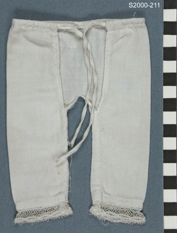 Wit katoenen onderbroek met open kruis. Lange rechte pijpen, afgezet met kant. Zoom als taille met strikband. De onderbroek is op een machine die kettingsteek stikt gemaakt.