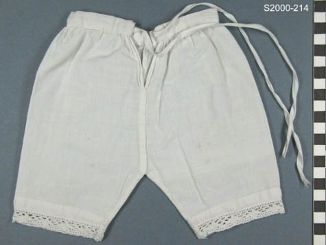 Wit katoenen onderbroek met halflange pijpen, tailleband en split middenachter. Strikbanden als sluiting. Kantgarnering langs zoom broekspijpen. Met de hand genaaid.