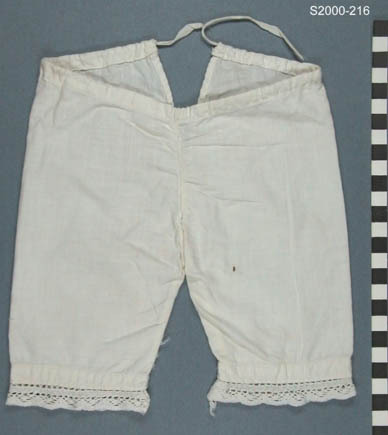 Wit katoenen onderbroek met split middenachter. Halflange pijpen, gezoomd en afgewerkt met kantstrook. Zoom voor taille met strikband als sluiting. Machinaal.