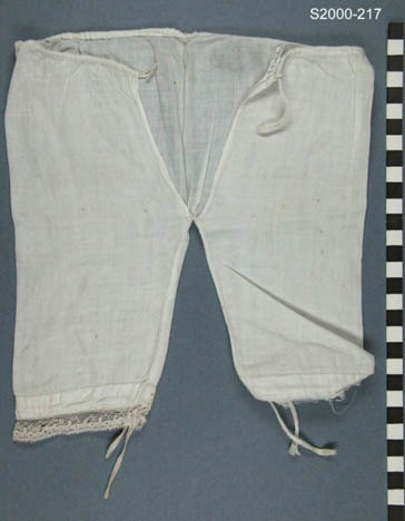 Wit katoenen onderbroek met split middenachter. De broek is uit een stuk geknipt. Lange pijpen met zoom + kantgarnering. Deze strook kant is rechts afgescheurd. In de zoom van de pijpen een strikbandje van veterband. Taillezoom met strikband van wit katoenen koord. Handwerk.