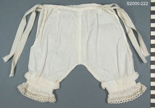 Wit katoenen onderbroek met lange pijpen. Zijsplitten. Voor- en achterklep afgezet met bies. Strikbanden als sluiting. Pijpen afgezet met sierband met zig-zag. Strak bandje, opnaadje in pijp. Slordig, gedeeltelijk met de hand genaaid.