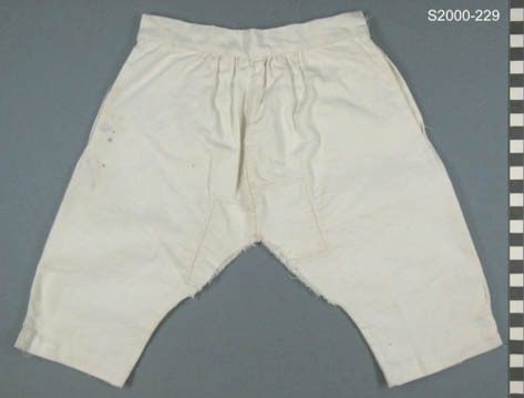 Witte onderbroek van keperkatoen. In achterpanden zijn inzetstukken genaaid bij het kruis (nog niet gesloten) Handwerk, rijgsteek fase.