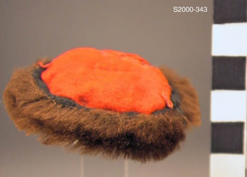 Hoed van rood vilt met bruine rand van imitatiebont
