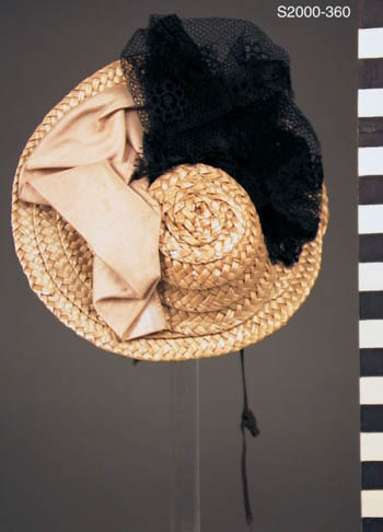 Strohoed met zwarte tule en oud-roze lint