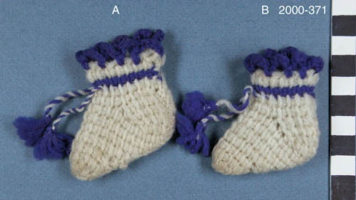 Paar witte wollen sokjes met fel paarse accenten. Gehaakt met tunische