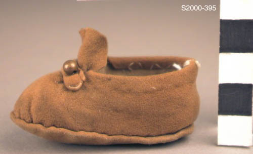 Eén lichtbruine leren instap schoen. Ronde neus. Over de voorvoet een hoge lip