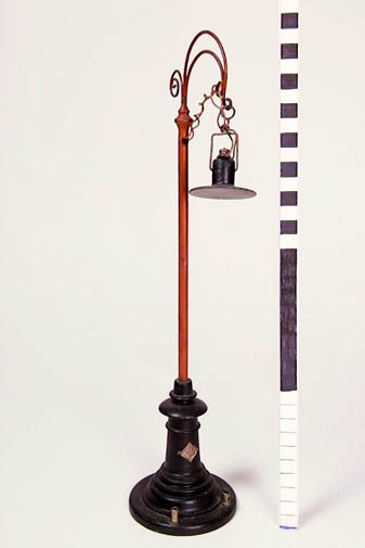 geverfd blik en hout; booglamp met peertje, elektrisch; zwarte voet, oranje paal en boog, zwarte lampenkap; oranje draad; op de voet 2 contactpunten en een blank merkplaatje