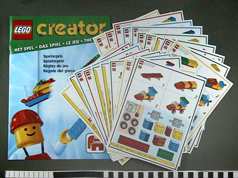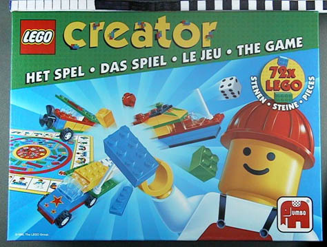 Spel Creator bestaande uit een doos met daarin 20 kaarten, 1 bord, handleiding en 72 lego steentjes. Speelgoed van het jaar 2002