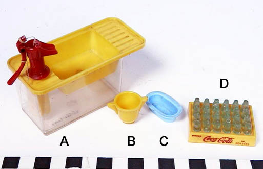 Aanrecht met pomp met 2 bakjes en krat met coca-colaflesjes
