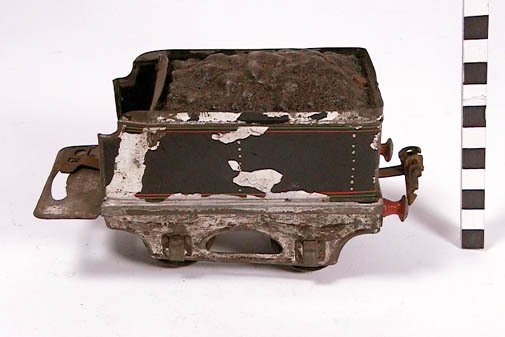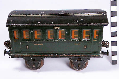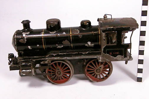 Treinset bestaande uit:Locomotief, tender, personenwagon, goederenwagon, opwindsleutel, drie treinkaartjes en drie bestemmingsborden