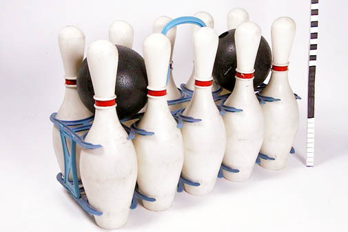 Kegelspel bestaande uit 10 kegels en 2 ballen aan elkaar bevestigd met een frame