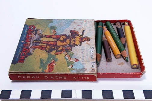 potloden al flink opgebruikt, op kartonnen afbeelding van Man en kind in berglandschap (Uit verhaal Alleen op de wereld?)