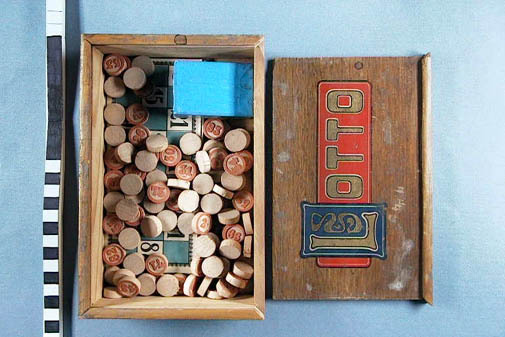 Lottospel in houten doos met schuif deksel. Het spel bestaat uit 12 kaarten, 90 stenen en 14 glazen plaatjes